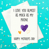 Our "Happy Mother's Day - I love you almost as much as I love my phone" card is guaranteed to make your mom laugh (or roll her eyes, depending on her sense of humour).