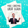 Bring some yuge festive spirit to the season with this cheeky “Make Christmas Great Again” card! Featuring a certain well-known figure in a Santa hat, surrounded by confetti and Christmas joy, this card is sure to get a reaction—whether it’s a chuckle, a groan, or a spirited debate over the Christmas turkey. Perfect for those who like their holiday greetings with a dash of political satire, this card straddles the line between festive cheer and just a hint of chaos.