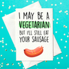 Say hello to our unapologetically cheeky “Vegetarian Sausage” Card – perfect for the herbivore who’s still got a taste for meat, if you know what I mean. Featuring the innocent phrase “I may be a vegetarian but I’ll still eat your sausage,” this card is equal parts naughty, hilarious, and dangerously snacky.
