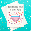 - Bold and flirty statement that reads “YOUR BIRTHDAY TREAT IS IN MY PANTS,” set against an adorable array of hearts