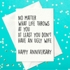 This bold and brilliantly irreverent anniversary card is the perfect way to honour another year of love, laughter, and being blessed with a wife who could stop traffic—legally or otherwise. Ideal for couples who appreciate banter over bouquets, and who aren’t afraid to celebrate the shallow things in life... like devastating beauty.