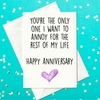 Celebrate your long-term commitment to winding each other up with this gloriously cheeky anniversary card. Whether you're partners in crime or just very attached flatmates who occasionally kiss, this sassy little number says “I love you” the Prickly Cards way – with a smirk and a wink.