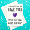 Behold, the "Hawk Tuah - Spit on That Thang" card, brought to you by the delightfully cheeky minds at Prickly Cards! This isn't just any old card – this A6 beauty is for that mate of yours who thrives on banter and isn't shy about a bit of cheek.